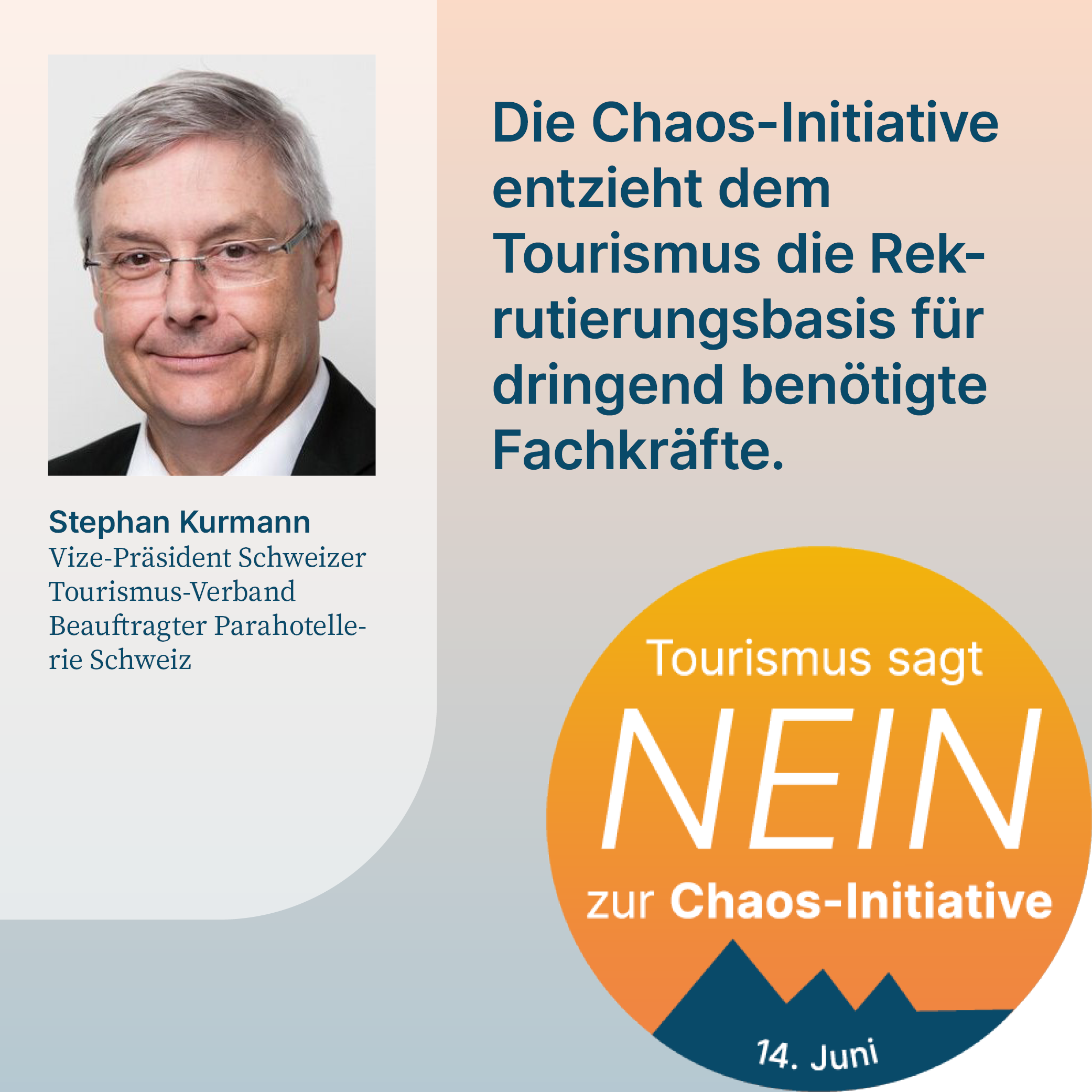 Die Chaos-Initiative, die am 14. Juni 2026 zur Abstimmung kommt, verlangt eine willkürlich gesetzte Obergrenze der Bevölkerungszahl in der Schweiz. Damit soll zukünftig die auf den Arbeitsmarkt ausgerichtete Migration unterbunden und der Wirtschaft wichtige Fachkräfte entzogen werden. Um die Obergrenze von zehn Millionen einzuhalten, müsste auch das Freizügigkeitsabkommen (FZA) mit der EU aufgekündigt werden. Aufgrund der Guillotine-Klausel werden bei einer Kündigung des FZA alle Abkommen der Bilateralen I hinfällig. Die Initiative gefährdet somit den bilateralen Weg der Schweiz als Ganzes. Für den Tourismus ist dieser jedoch von grosser Bedeutung. Die Rekrutierung von Fachkräften, die internationale Anbindung der Schweiz und der Zugang zum Binnenmarkt werden mit der Initiative bedroht. Die Annahme der Initiative würde der gesamten Schweizer Wirtschaft und insbesondere dem Tourismussektor grossen Schaden zufügen und ein grosses Chaos anrichten. Aus diesem Grund wird die Initiative als «Chaos-Initiative» bezeichnet.